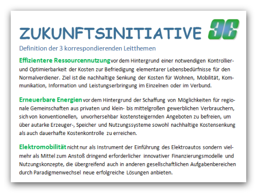 IDEENSCHMIEDE immer initiativNeben den Auftragsarbeiten ist die IDEENSCHMIEDE immer mit offenen Augen und Ohren unterwegs, um aktiv innovative Angebote zu kreieren oder andere zu animieren, sich an entsprechenden Aufgabenstellungen zu beteiligen. Die Möglichkeiten, die mit der Markteinführung des Elektroautos verbunden sind, haben zur Gründung des Programms Zukunftsinitiative3E geführt. Mit unabhängigen und wirtschaftlich nachhaltig tragfähigen Konzepte - mit möglichst vielen Partnern umsetzbar gemacht - soll das Elektroauto in allen möglichen Anwendungsfeldern zum Bestandteil des verkehrstechnischen Alltags werden.
